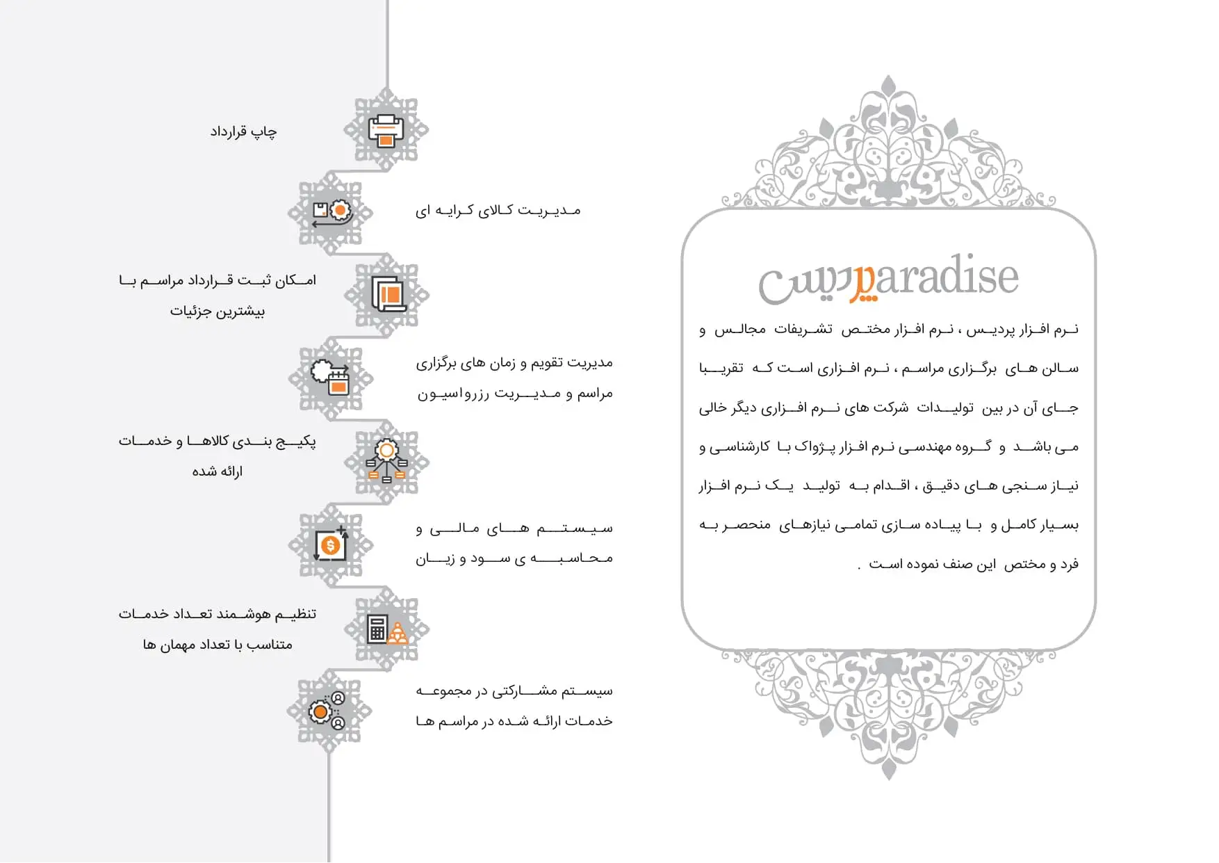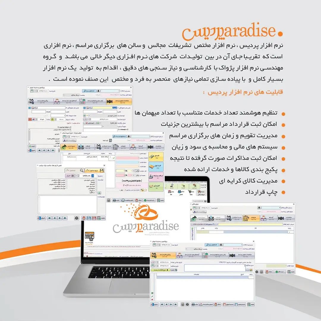 نرم افزار پردیس محصول شرکت مهندسی نرم افزار پژواک می تواند که نظم و انظبات را در کنار مدیریت شما به مراسم های برگزار شده اهدا کند و عملا با مکانیزه شدن مجموعه بسیاری از هزینه ها کاهش یافته و سودآوری بیشتری را به ارمغان می اورد.