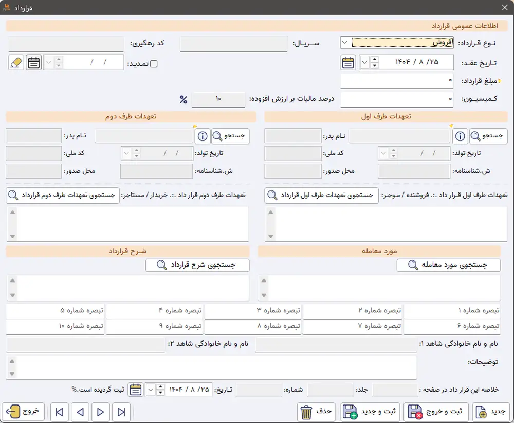 - صدور قولنامه و قرارداد استاندارد با بندهای سفارشی و خروجی چاپی (PDF).
