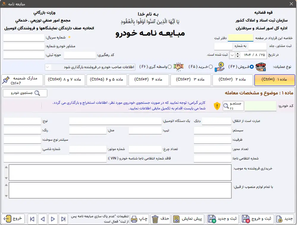 قالب قولنامه و قرارداد با سربرگ نمایشگاه و بندهای سفارشی آماده چاپ (PDF) است. میتوانید اطلاعات خودرو، خریدار/فروشنده، شرایط پرداخت، شماره چکها و پیوستها را آرشیو کنید و با جستجو روی هر فیلد (پلاک، VIN، نام طرفین و...) به پرونده کامل دسترسی داشته باشید.