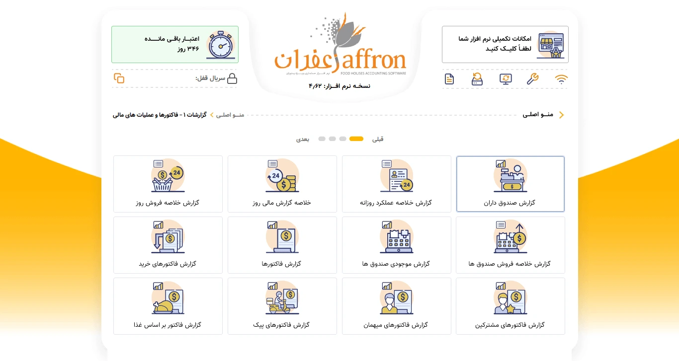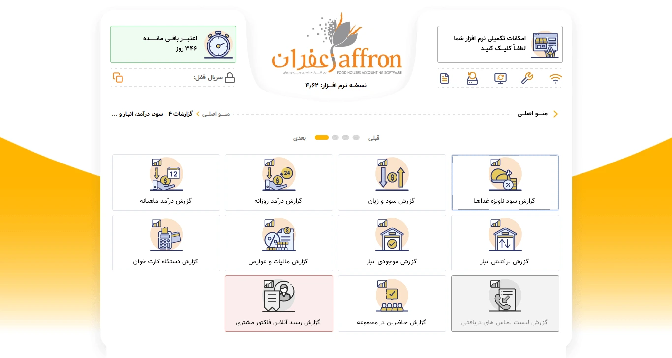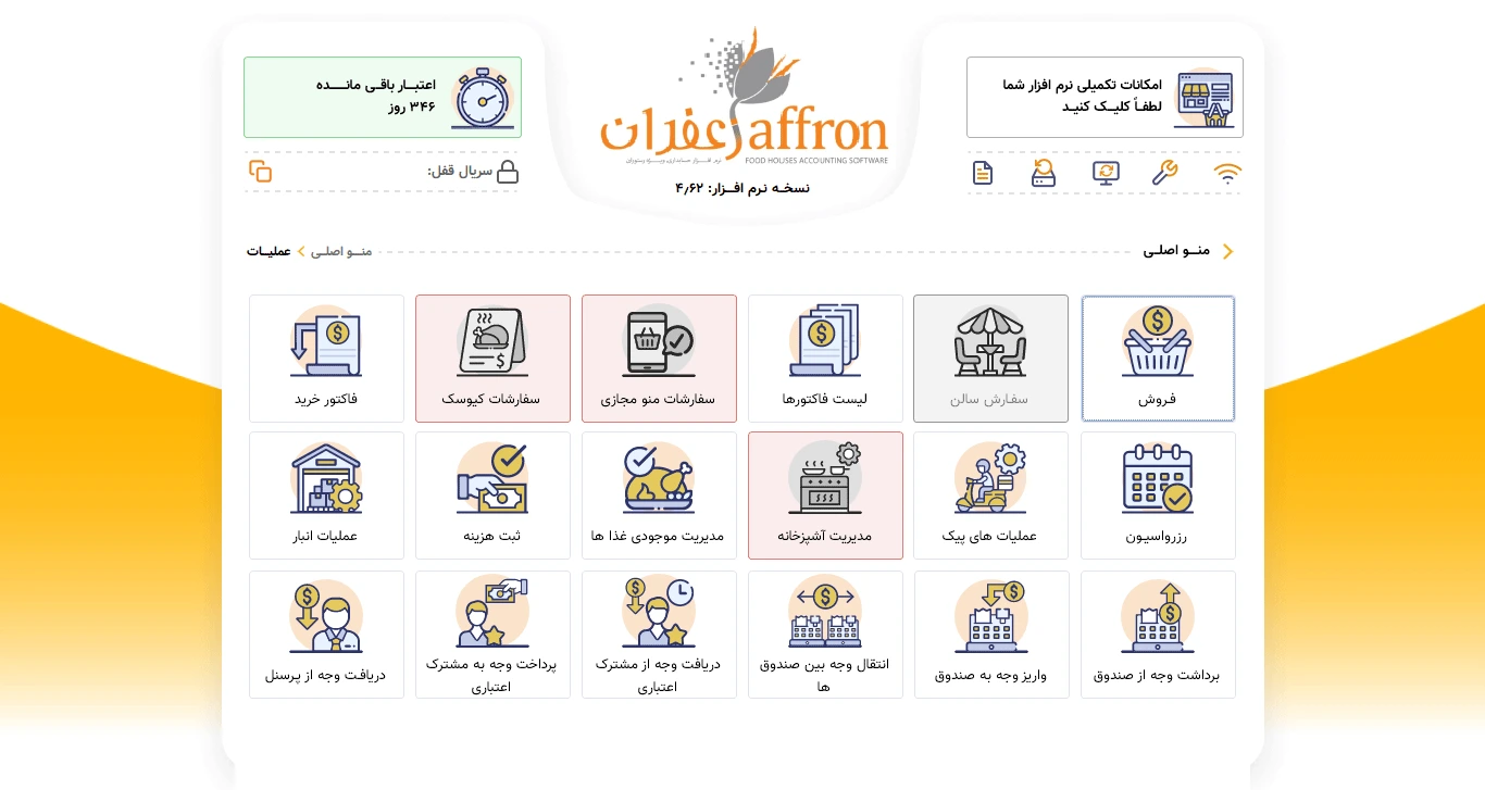 نرم افزار رستورانی زعفران استاندارد ، دارای همه قابلیت های لازم برای مدیریت یک مجموعه غذایی شامل ورود اطلاعات پایه ، ثبت فروش ها و صدور فیش و در نهایت اخذ انواع گزارش های آماری از فروش ها و دریافت ها ،موجودی ،حساب اعتباری ،حساب صندوق و ... می باشد