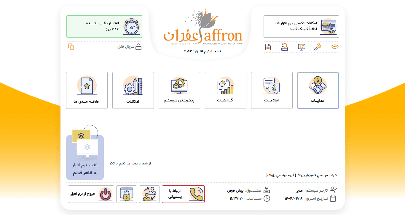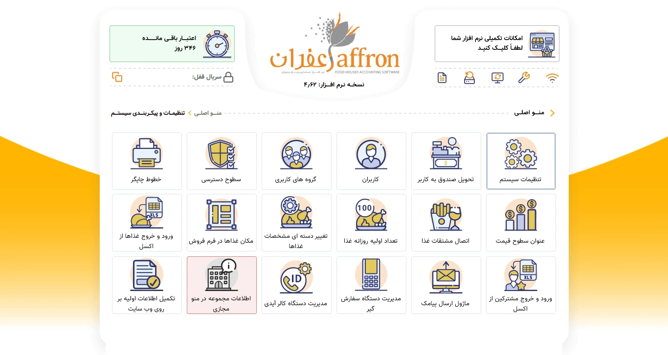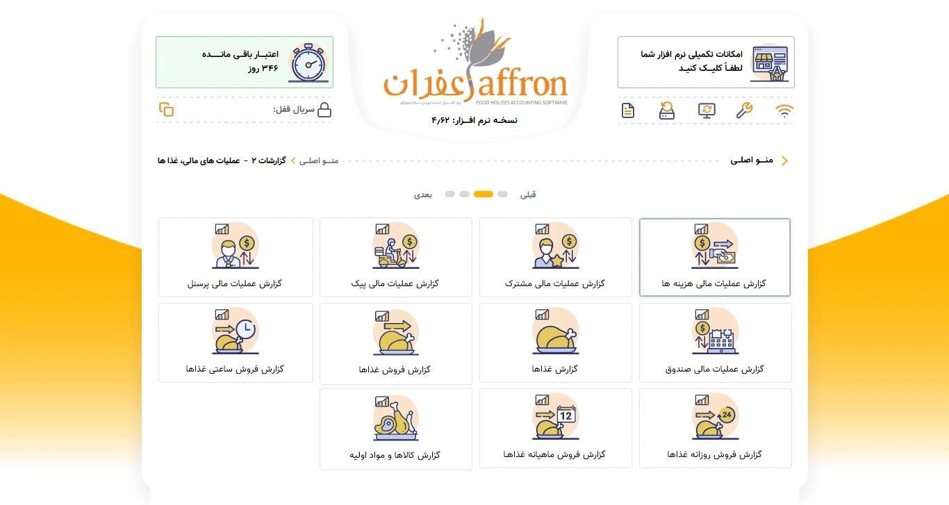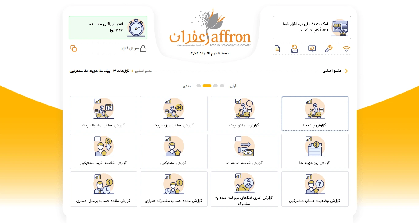 نرم افزار رستورانی زعفران استاندارد ، دارای همه قابلیت های لازم برای مدیریت یک مجموعه غذایی شامل ورود اطلاعات پایه ، ثبت فروش ها و صدور فیش و در نهایت اخذ انواع گزارش های آماری از فروش ها و دریافت ها ،موجودی ،حساب اعتباری ،حساب صندوق و ... می باشد