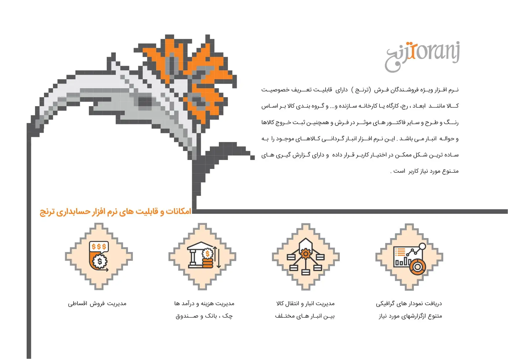 نرم افزار حسابداری فرش و موکت فروشی (ترنج) ویژه فروشندگان فرش ، گبه ، موکت ، یک نرم افزار حسابداری و مدیریت مالی و با در نظر گرفتن همه نیازها و ارائه راهکار به ساده ترین روش ممکن و با در نظر گرفتن همه نیازهای تخصصی در این مشاغل می باشد.